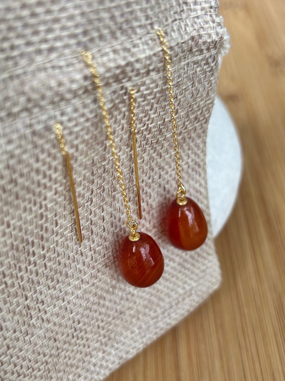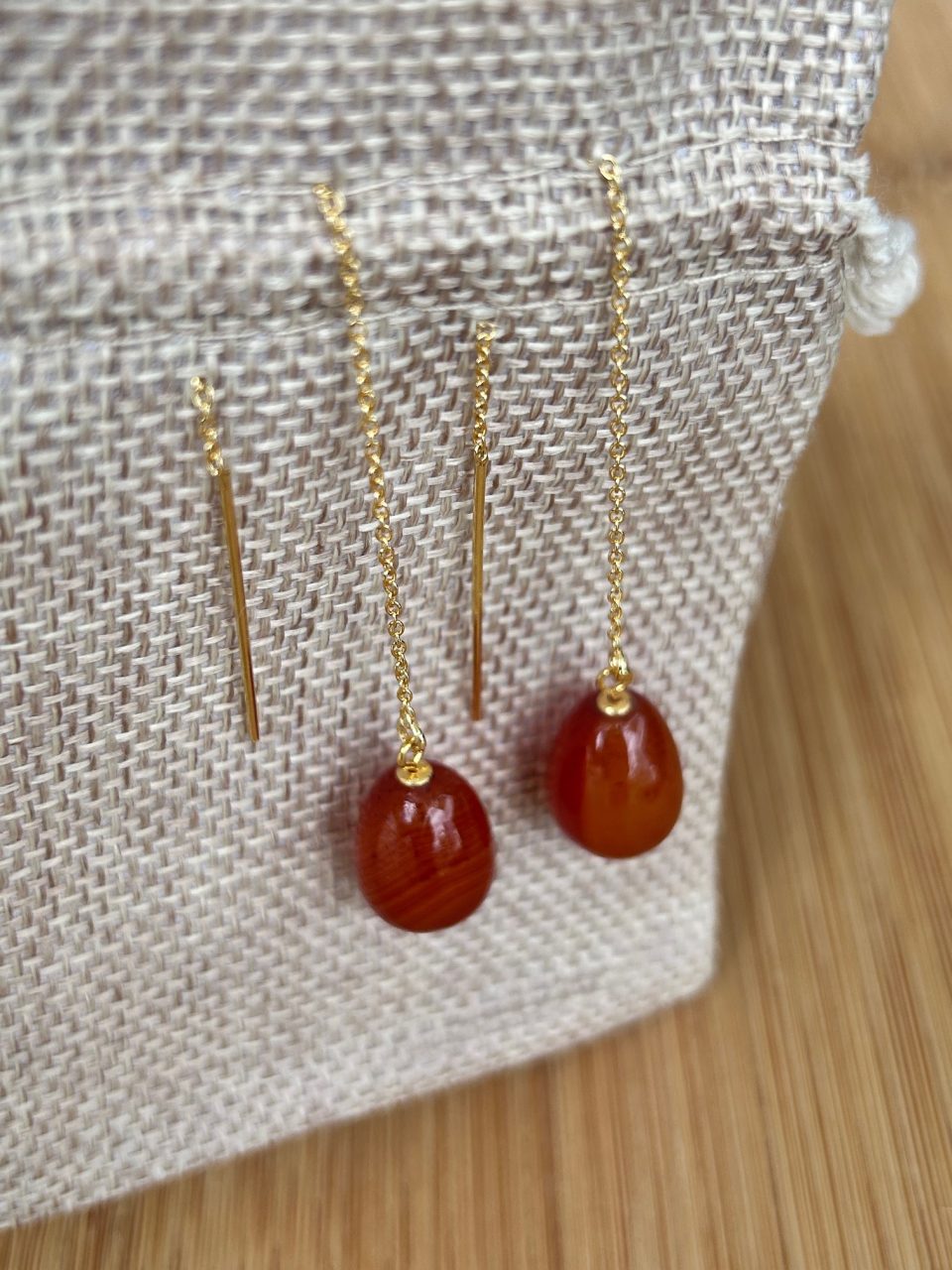 Silver 925 gold, Add a touch of vibrant warmth and modern elegance to any look with these stunning threader earrings. Featuring a rich, fiery carnelian briolette suspended from a sleek silver 926 gold plated chain, this lightweight design offers subtle movement and sophisticated flair. Carnelian, known as the “sunset stone,” is a gemstone believed to inspire confidence and motivation.